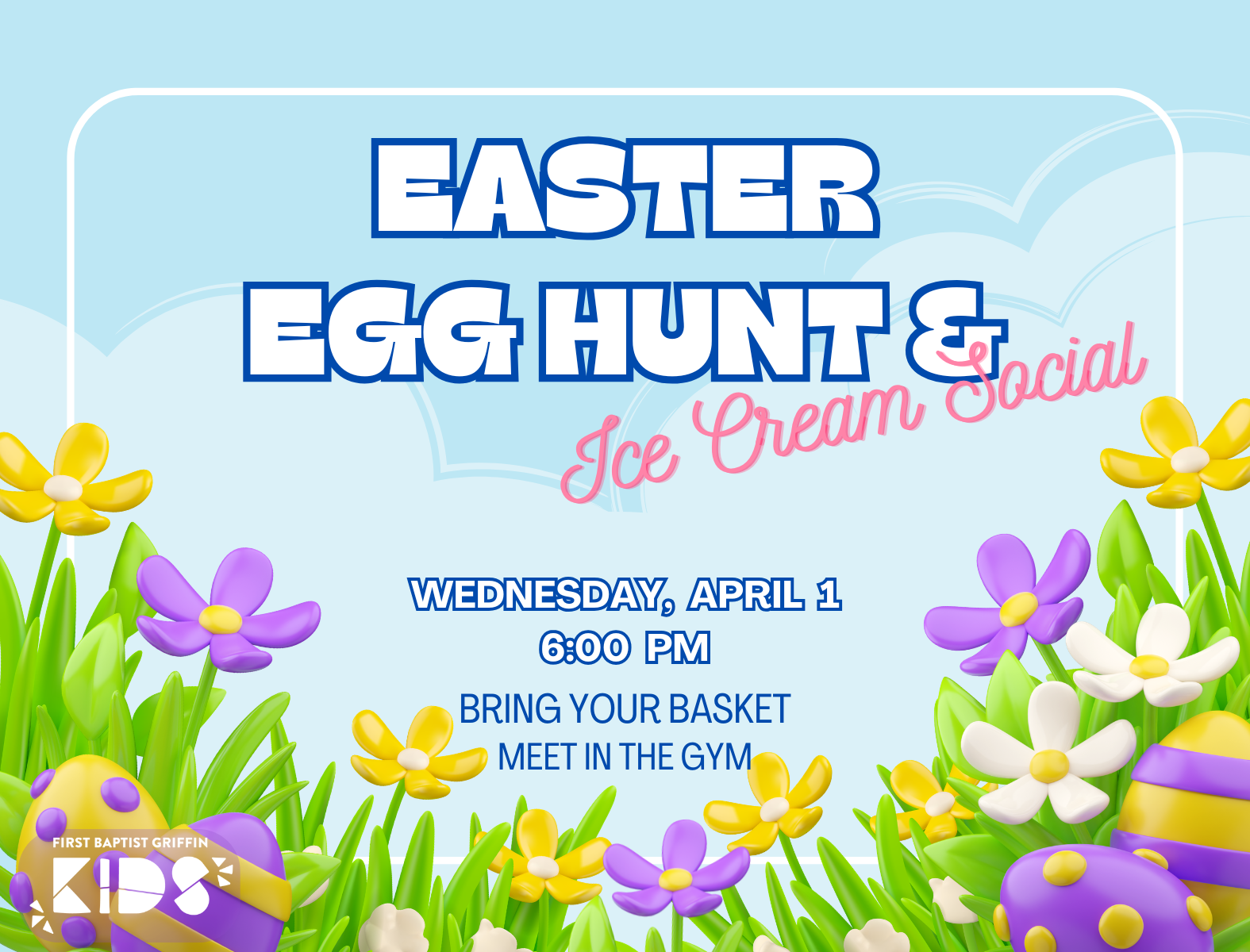 KIDMIN will hold an Easter Egg Hunt and Ice Cream Social on Wednesday, April 1, at 6:00 p.m. at the church. Children should meet in the gym ready to hunt Easter eggs. Don’t forget to bring your basket!